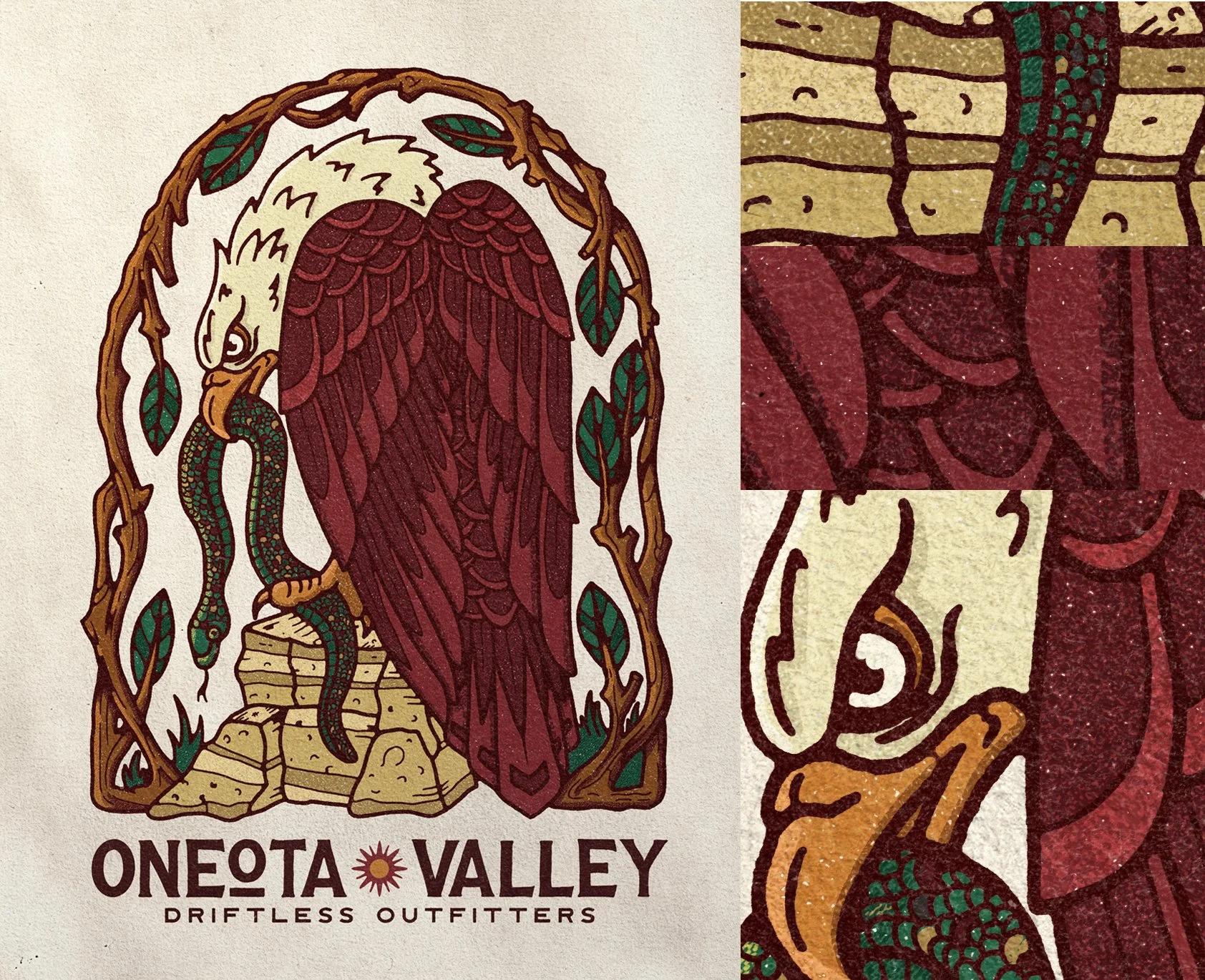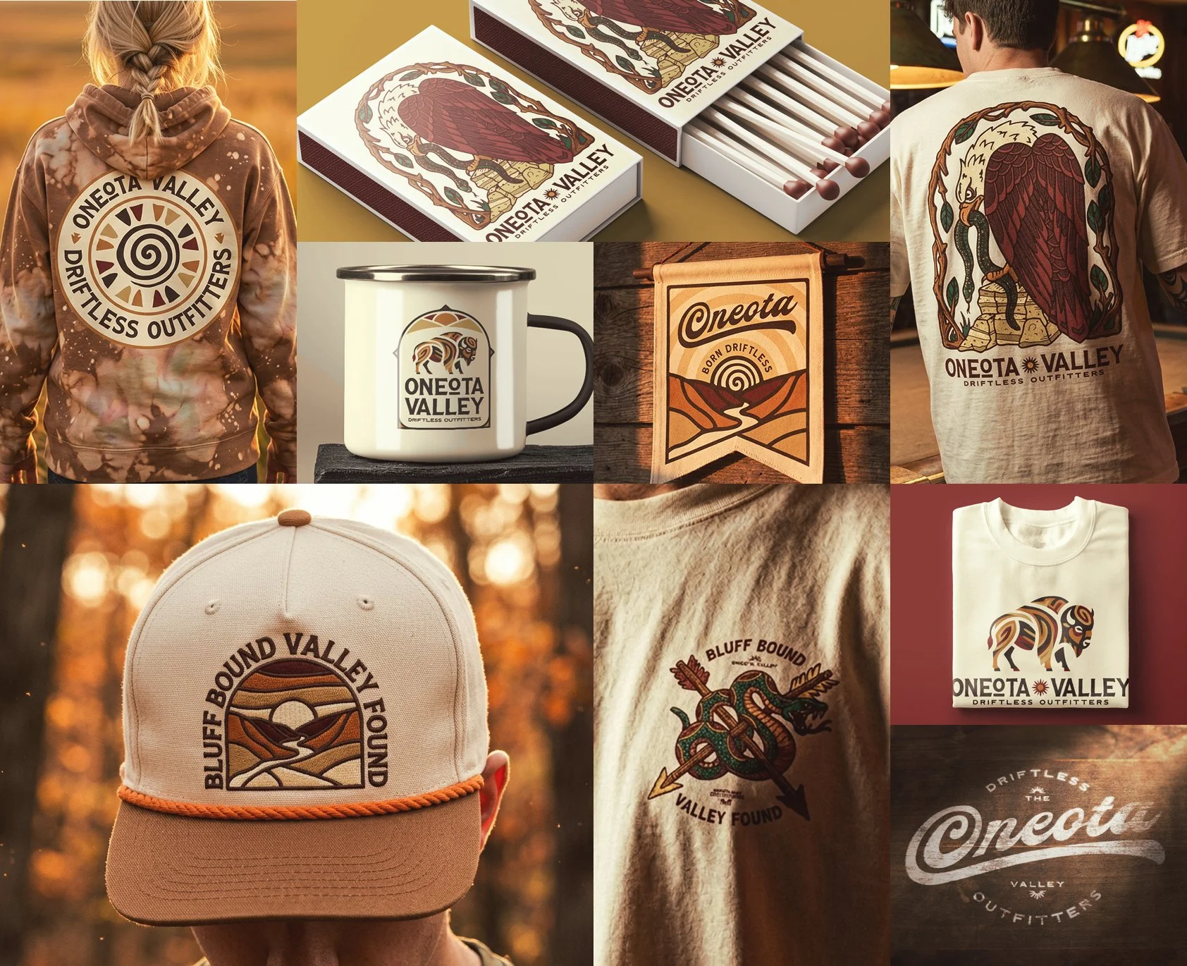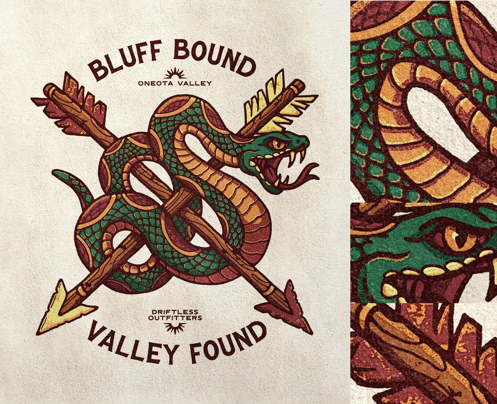 Oneota Valley Driftless Outfitters is an outdoor apparel line from the Bogh Brothers Design Company. The brand is rooted in the driftless landscape of Decorah, Iowa, where founders Alex and Adam spent their formative years. Its aesthetic blends the rugged outdoors with influences like American traditional tattoos, stained glass, and watercolor textures. This project reflects the specific art and education that defined the brothers’ time in the Oneota Valley. The result is a collection of functional gear built for anyone who values both a good trail and a sharp design.